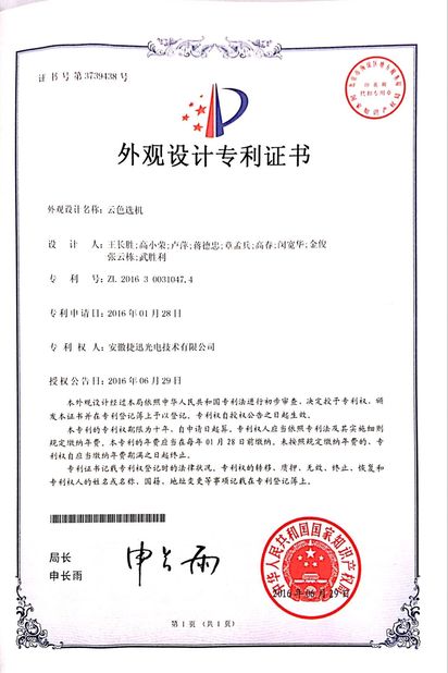 Standard:Cloud Color Sorter Patent Number:3739438 Issue Date:2016-06-29 |